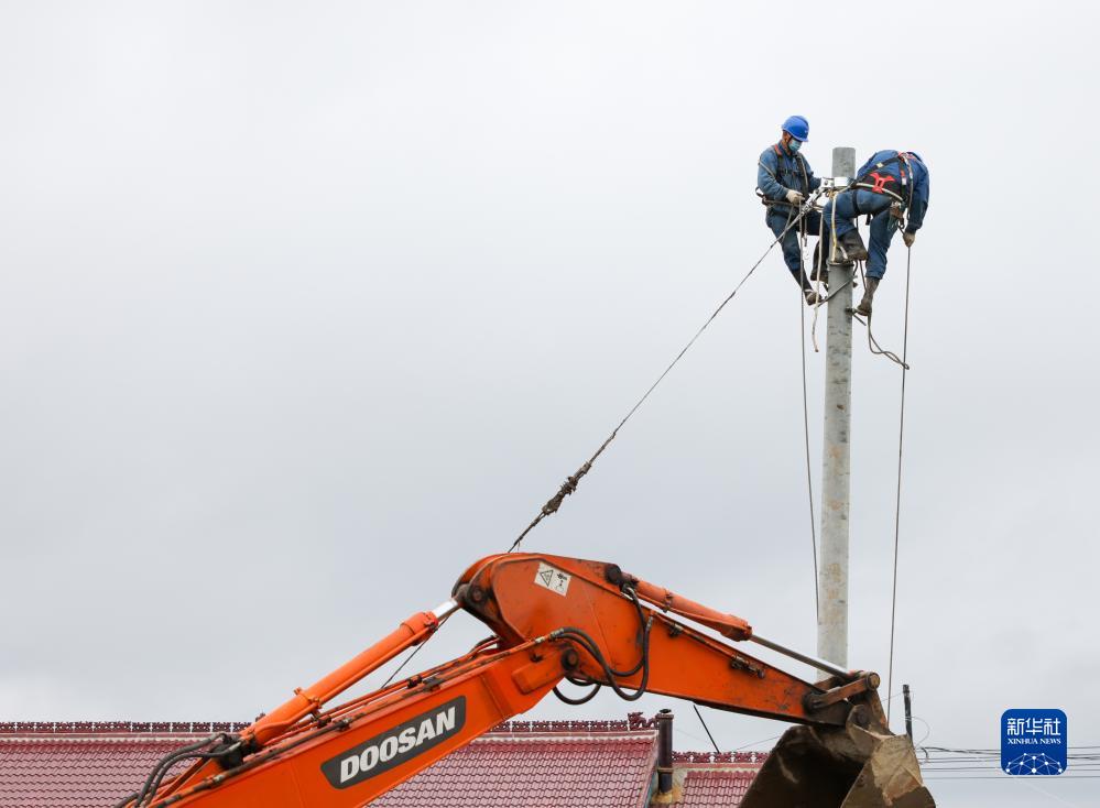 8月6日,電力工人在舒蘭市開(kāi)原鎮(zhèn)搶修被洪水損毀的供電線(xiàn)路。