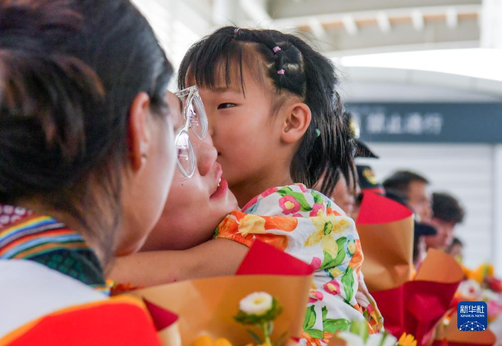 8月7日,在烏魯木齊站,Z180次列車乘務人員家屬迎接親人歸來。新華社記者 王菲 攝