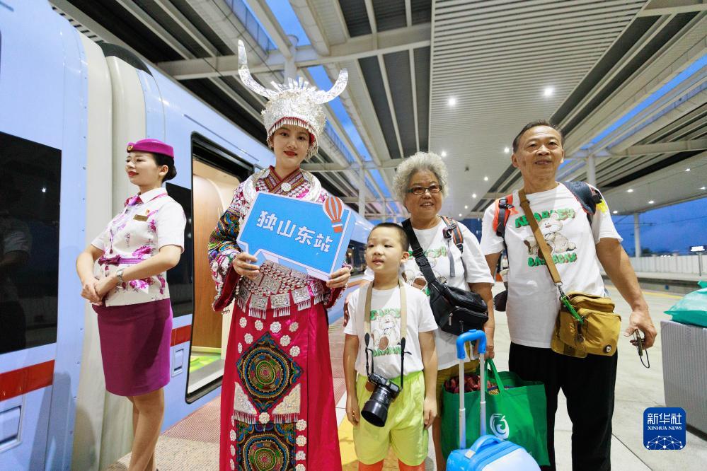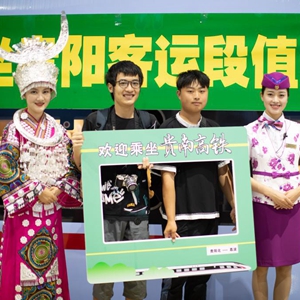 8月8日,旅客在貴陽北站和身著民族服裝的乘務員合影留念。