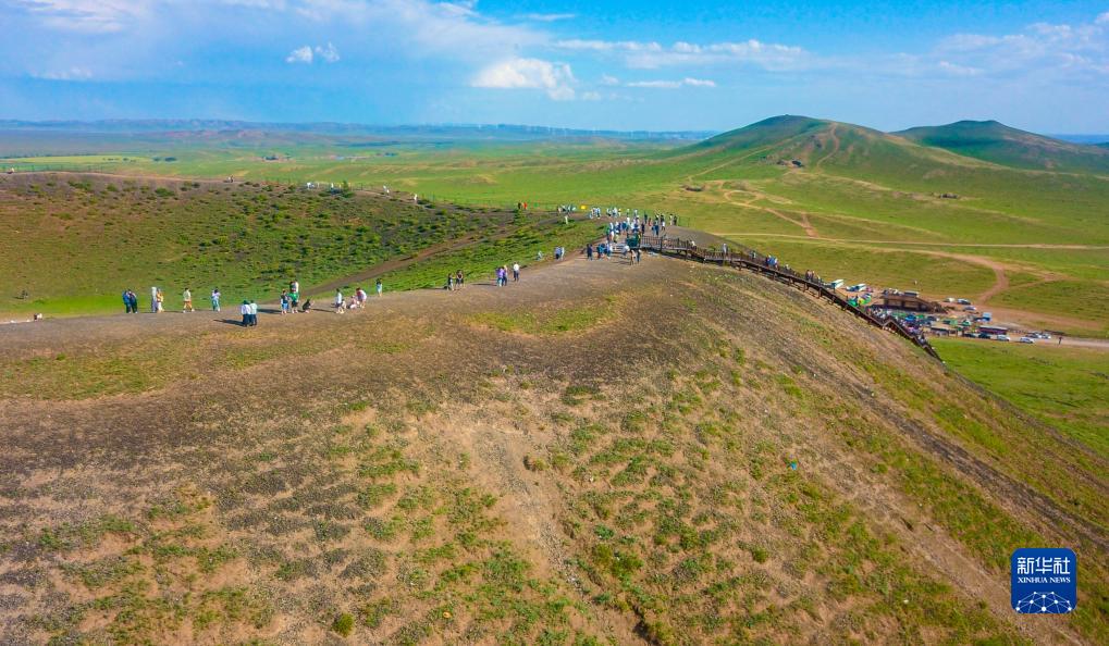 8月6日,游客在烏蘭察布市察哈爾右翼后旗草原上的火山上游覽(無人機照片)。