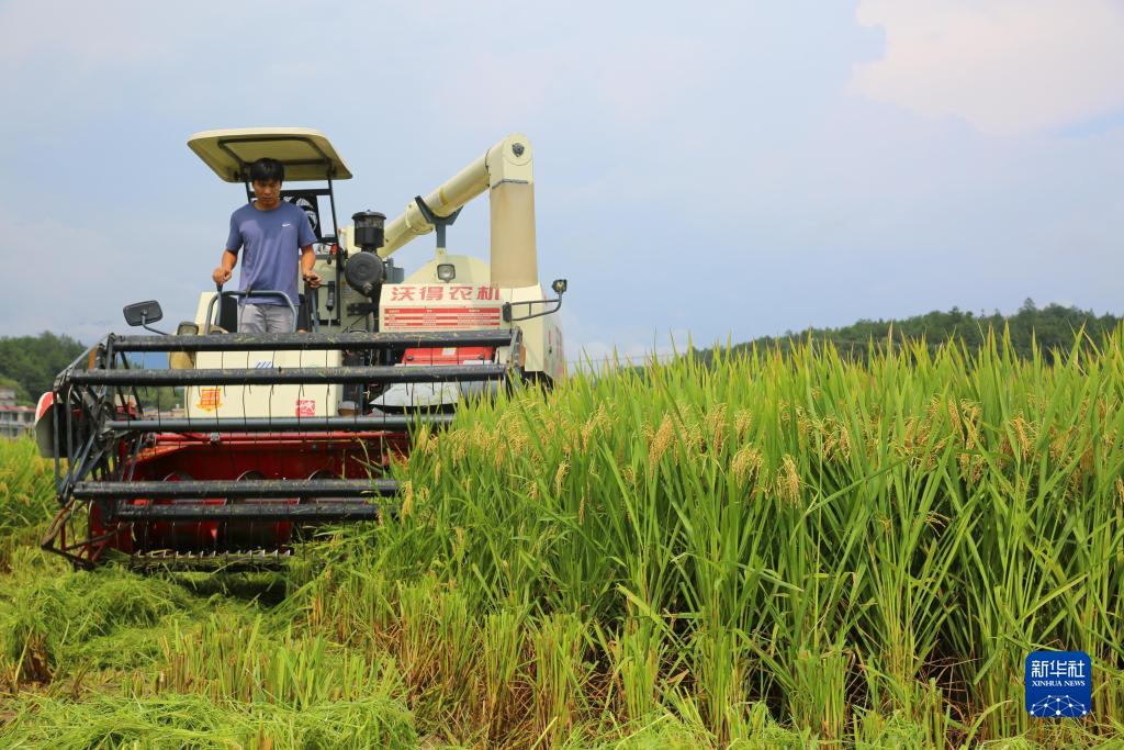 8月7日,在湖南省邵陽市隆回縣羊古坳鎮雷峰村超級雜交水稻高產攻關科研基地,農機手駕駛收割機收割再生稻。