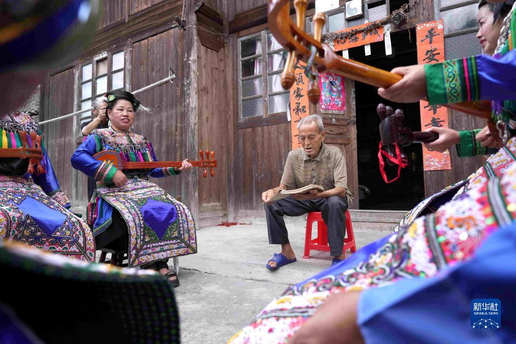 8月7日,在貴州省榕江縣寨蒿鎮(zhèn)扒王村,81歲老歌師龍上豪(中)向青年歌師傳授民歌普法知識(shí)。