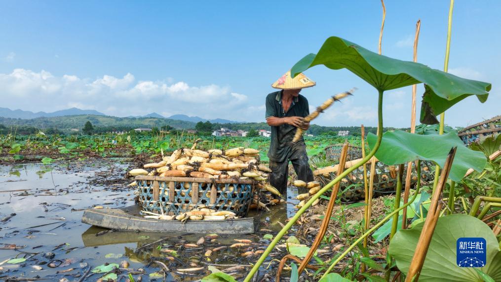 8月8日,在湖南省常寧市板橋鎮蓮藕種植基地,藕農在采收蓮藕(無人機照片)。