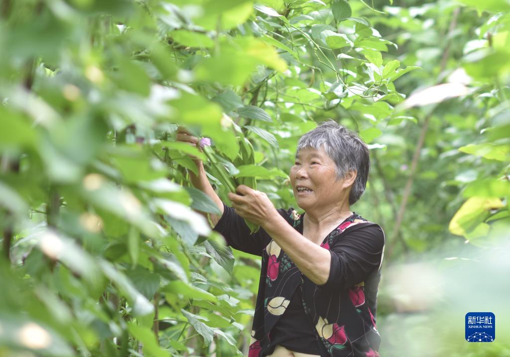 8月8日,在湖南省婁底市雙峰縣永豐街道白杉村,農(nóng)民在采摘刀豆。