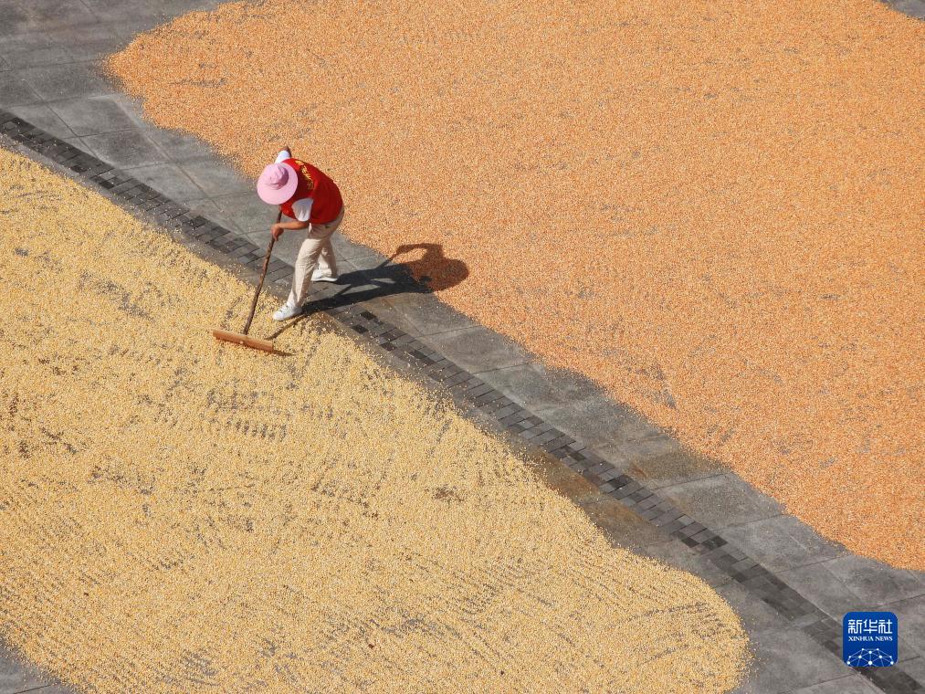 8月7日,四川省達州市達川區趙家鎮農民在院壩里晾曬玉米。
