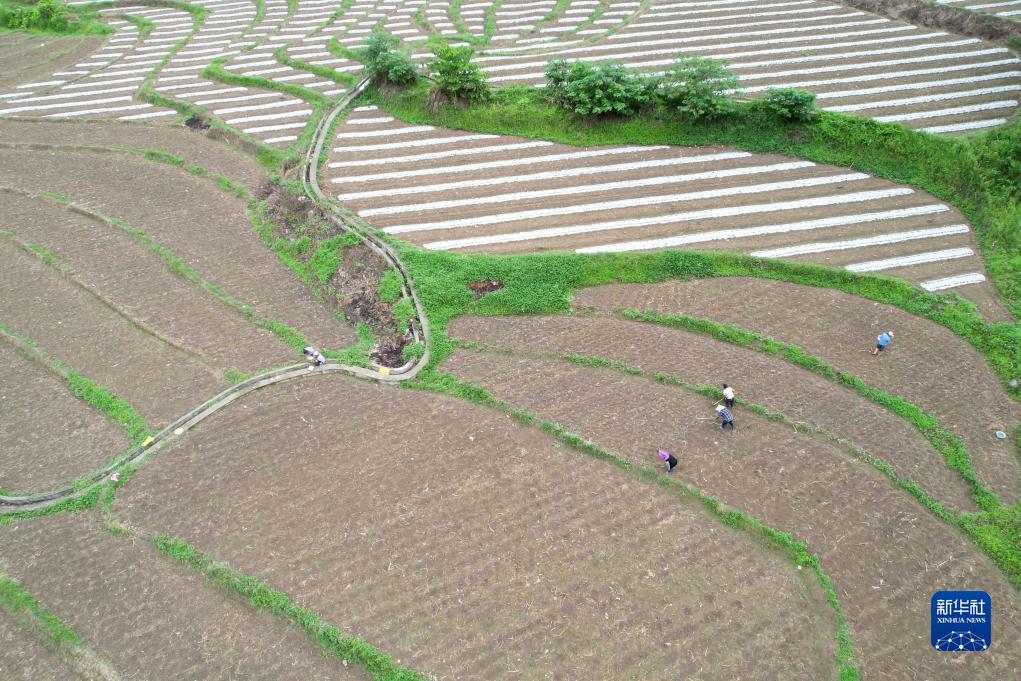 8月8日,村民在貴州省黔南布依族苗族自治州羅甸縣逢亭鎮床井村的田間勞作(無人機照片)。