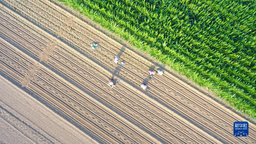 8月8日,山東省聊城市茌平區賈寨鎮邢胡劉村農民在田間種植甘藍(無人機照片)。