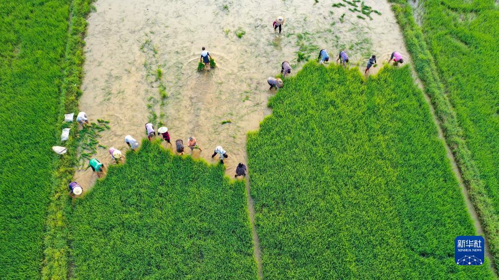8月8日,在湖南省常寧市板橋鎮(zhèn)樟塘村,農(nóng)民在起晚稻秧苗(無(wú)人機(jī)照片)。