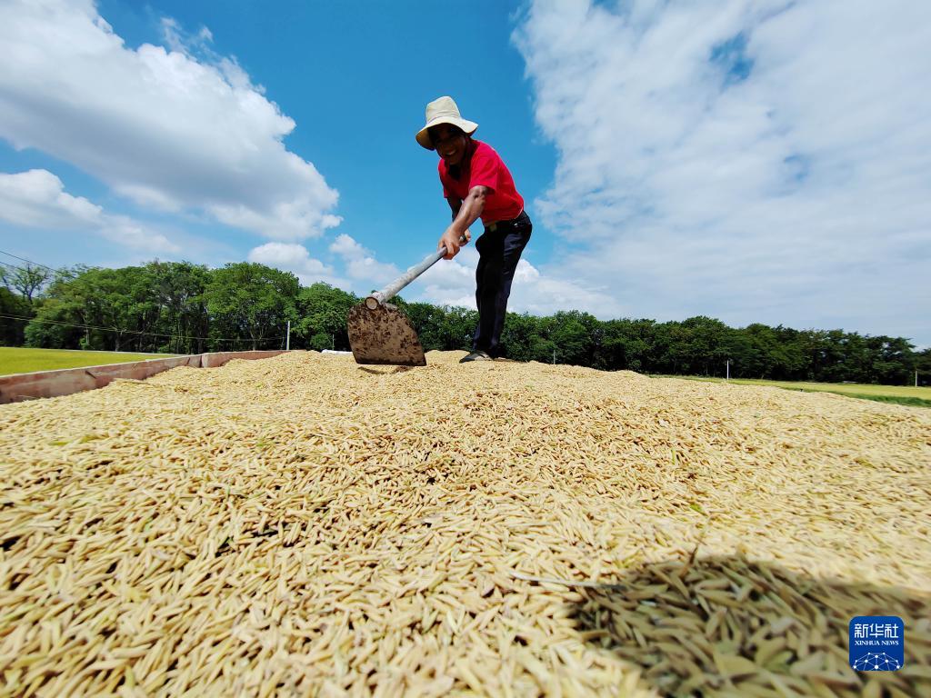 8月8日,在湖南省永州市道縣梅花鎮貴頭村,村民在整理裝車的稻谷(手機照片)。