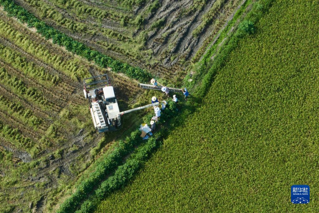 8月8日,收割機在重慶市北碚區三圣鎮古佛村收割稻谷(無人機照片)。