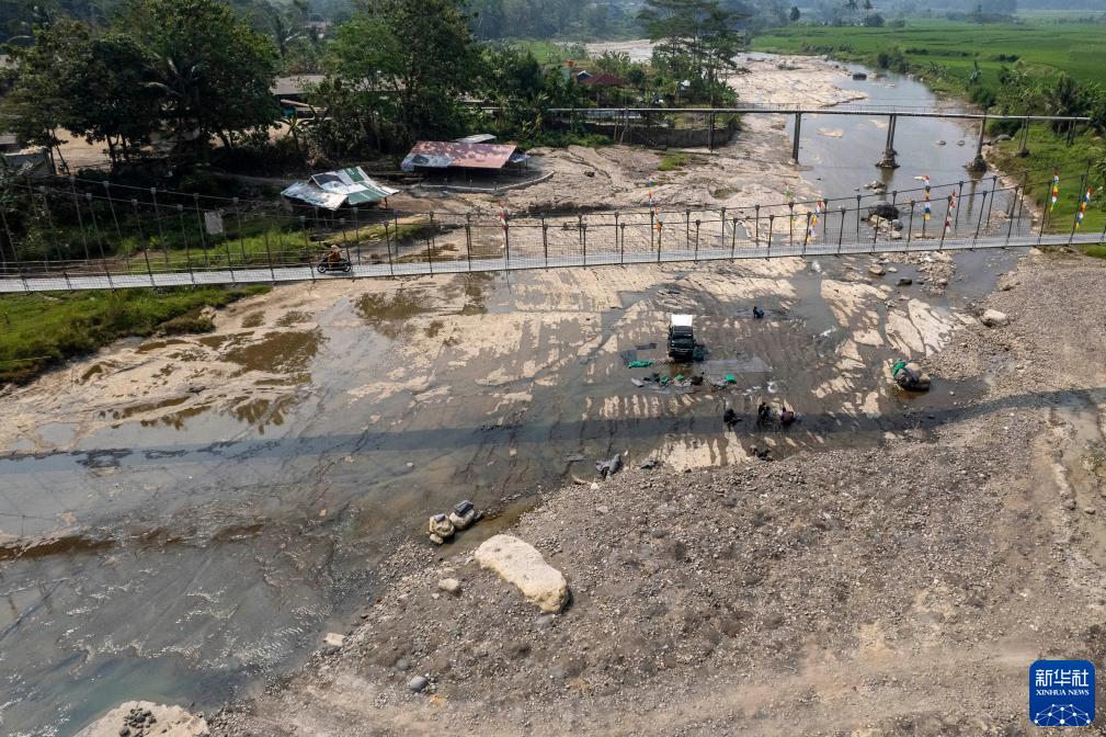 8月7日,在印度尼西亞西爪哇省的茂物,鄉間一條河流的水量大為減少幾近干涸(無人機照片)。