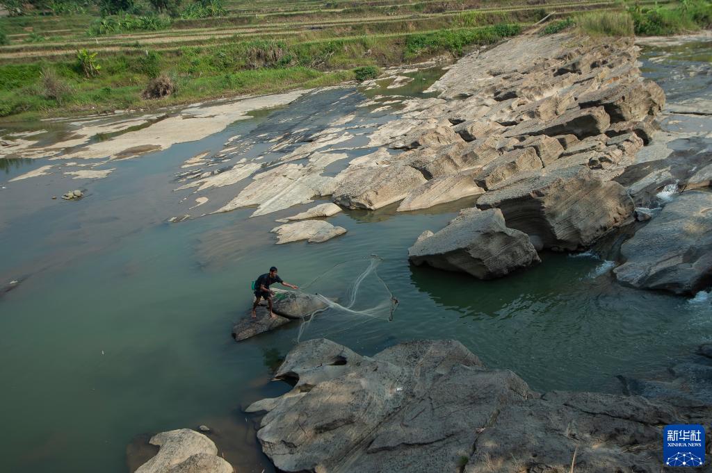 8月7日,在印度尼西亞西爪哇省的茂物,農民在鄉間一條河流上撒網捕魚。這條河流的水量大為減少幾近干涸。