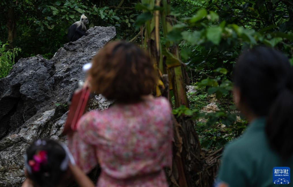 8月5日,在崇左市江州區羅白鄉的白頭葉猴國家級自然保護區,游客在觀看一只白頭葉猴。