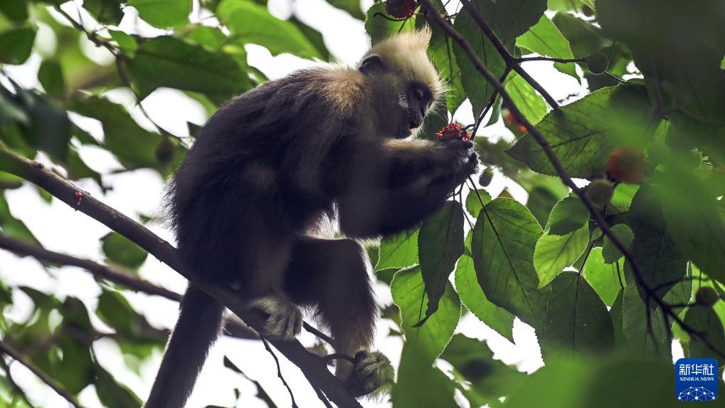 在崇左市江州區羅白鄉的白頭葉猴國家級自然保護區,白頭葉猴在林間飛躍,尋找鮮果(8月4日攝)。