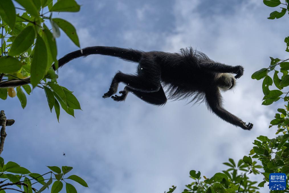 在崇左市江州區(qū)羅白鄉(xiāng)的白頭葉猴國家級自然保護區(qū),白頭葉猴在林間飛躍(8月5日攝)。