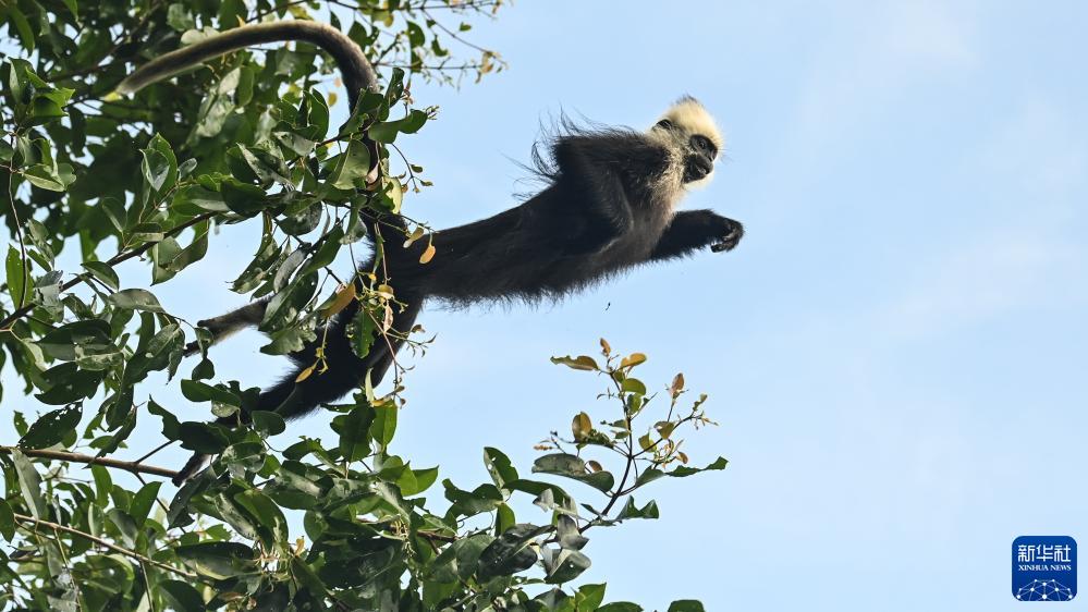 在崇左市江州區羅白鄉的白頭葉猴國家級自然保護區,一只白頭葉猴在蹬離樹梢飛躍(8月5日攝)。
