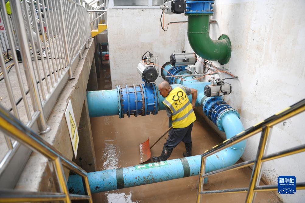 8月8日,工作人員在涿州市城區地表水廠設備間清理淤泥。