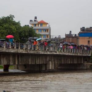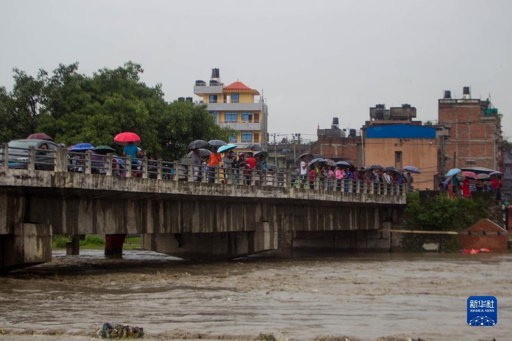 8月8日,在尼泊爾加德滿都,人們望著漲水的河流。