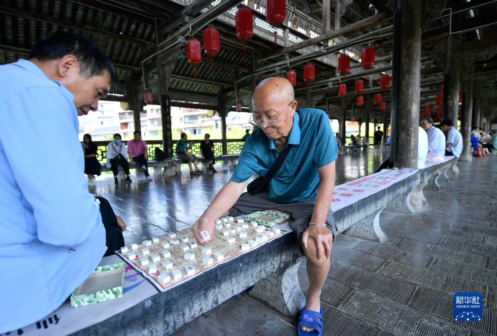 8月8日,市民在湖北省恩施土家族苗族自治州宣恩縣城風雨橋上下棋。