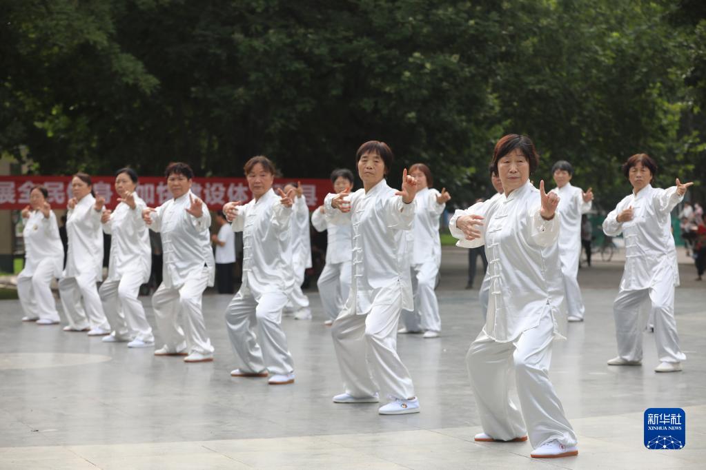 8月8日,在河南省焦作市溫縣太極游園,市民在全民健身日活動中表演八段錦。