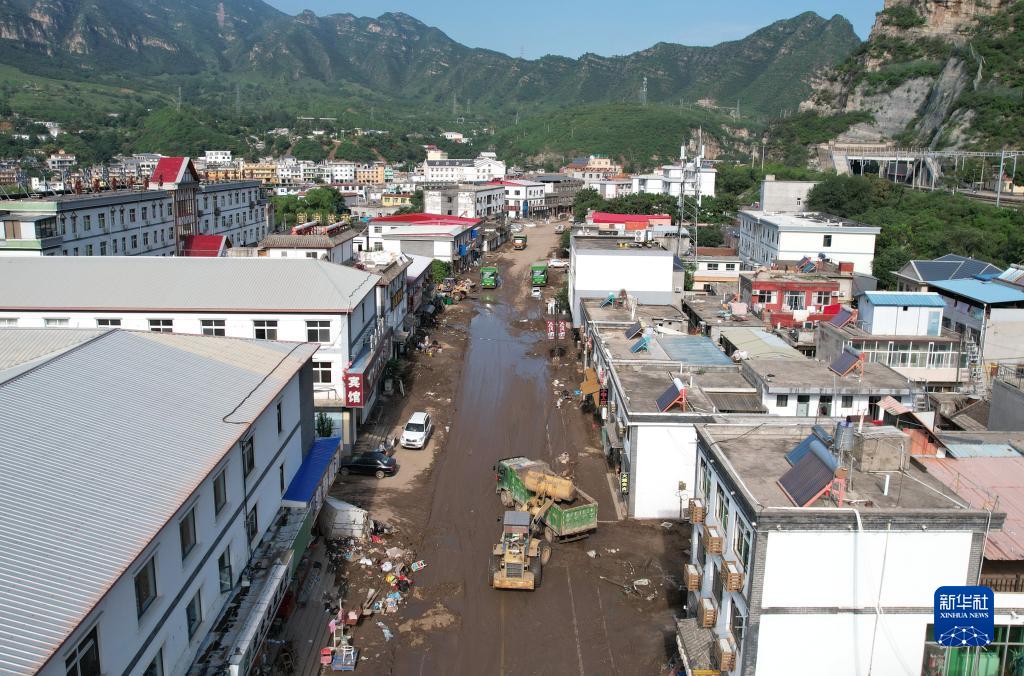 8月8日,在淶水縣三坡鎮(zhèn)下莊村,工人操作機(jī)械設(shè)備清理道路上的淤泥(無人機(jī)照片)。
