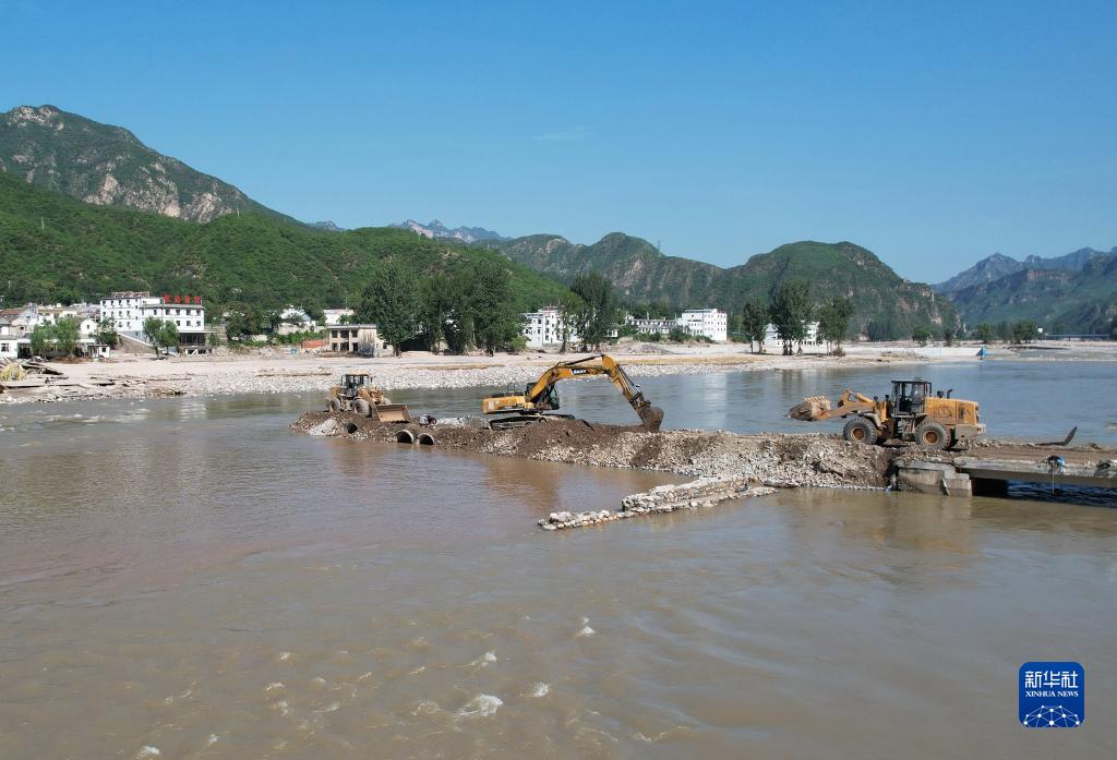 8月8日,工人操作機械設(shè)備搶修通往淶水縣三坡鎮(zhèn)上莊村的橋梁(無人機照片)。