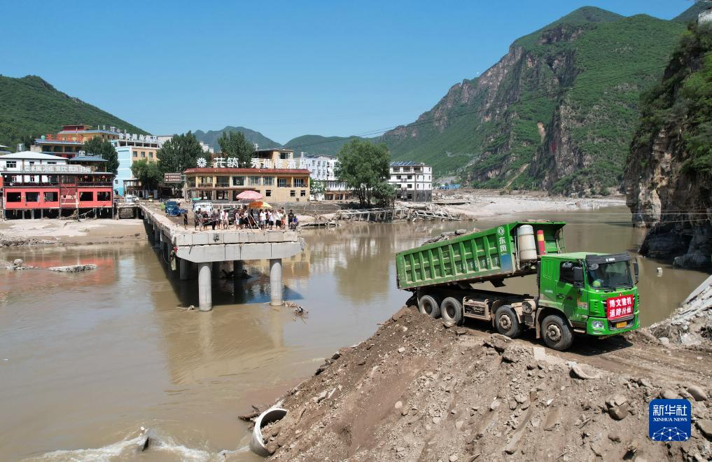 8月8日,工人操作機(jī)械設(shè)備搶修通往淶水縣三坡鎮(zhèn)劉家河村的橋梁(無(wú)人機(jī)照片)。