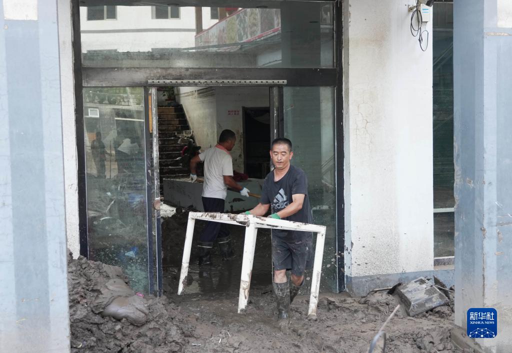 8月8日,淶水縣三坡鎮(zhèn)下莊村的村民在搬運家具。