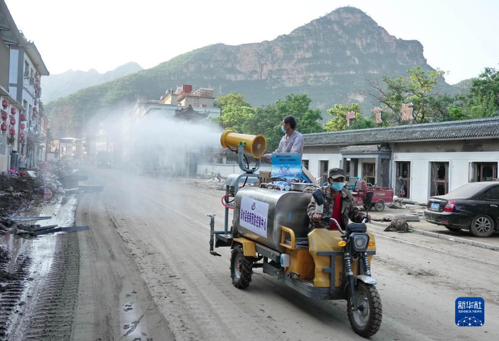 8月8日,志愿者在淶水縣三坡鎮下莊村進行消殺作業。