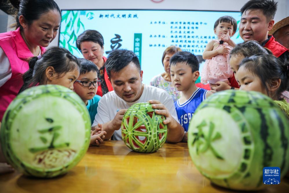 當日,浙江省湖州市長興縣畫溪街道在姚家村文化禮堂開展“多彩民俗迎立秋”主題活動,通過“瓜上雕刻”、“啃秋”吃西瓜、懸秤稱重等趣味活動,讓孩子們體驗傳統民俗,了解節氣的相關知識。