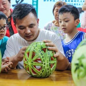 8月8日,在姚家村文化禮堂,非遺傳承人在教孩子們“瓜上雕刻”。