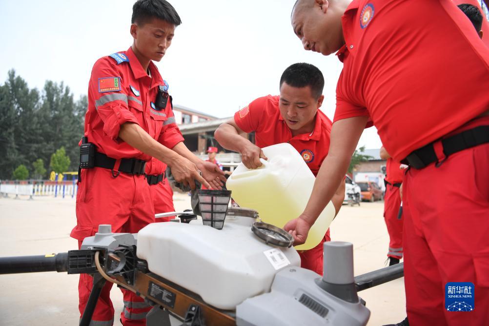 8月8日,工作人員在涿州市桃園街道忠義店村為消殺無人機加注消毒液。