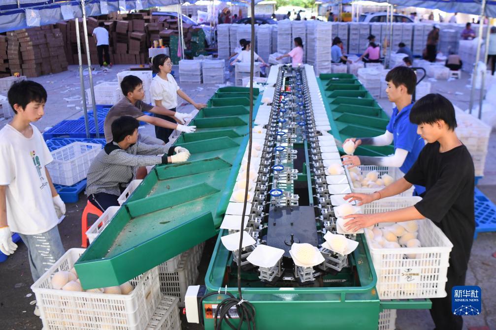8月8日,工作人員在炎陵縣下村鄉黃桃收購點分揀黃桃。