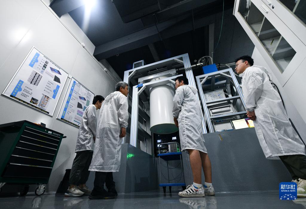7月22日,在位于上海張江的上海量子科學研究中心,彭承志(左二)和團隊成員在“祖沖之二號”前討論研究進展。