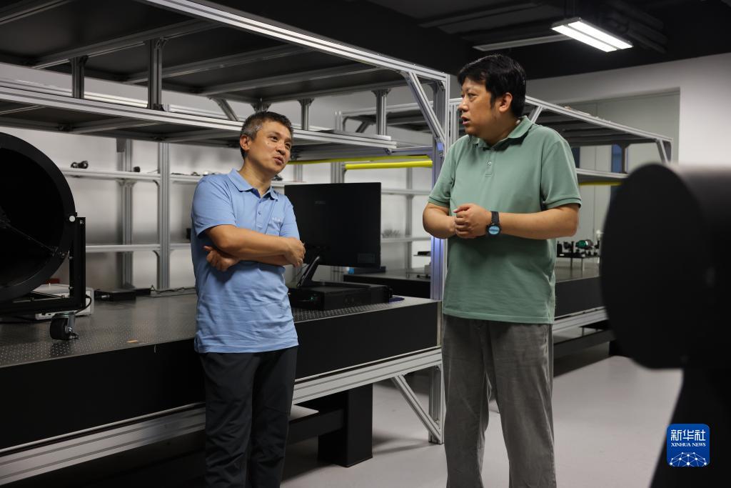 7月21日,在位于安徽合肥的中國科學技術大學先進技術研究院,彭承志(左)與任繼剛教授交流衛星地面站運行情況。
