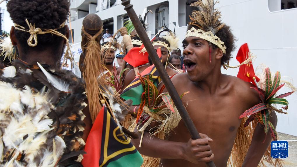 8月8日,中國海軍“和平方舟”號醫(yī)院船抵達瓦努阿圖共和國維拉港,身著傳統(tǒng)服飾的當?shù)孛癖娫跉g迎儀式上跳起歡迎舞蹈。