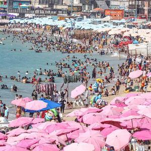 這是7月6日在埃及亞歷山大拍攝的人們在海邊避暑的場景。
