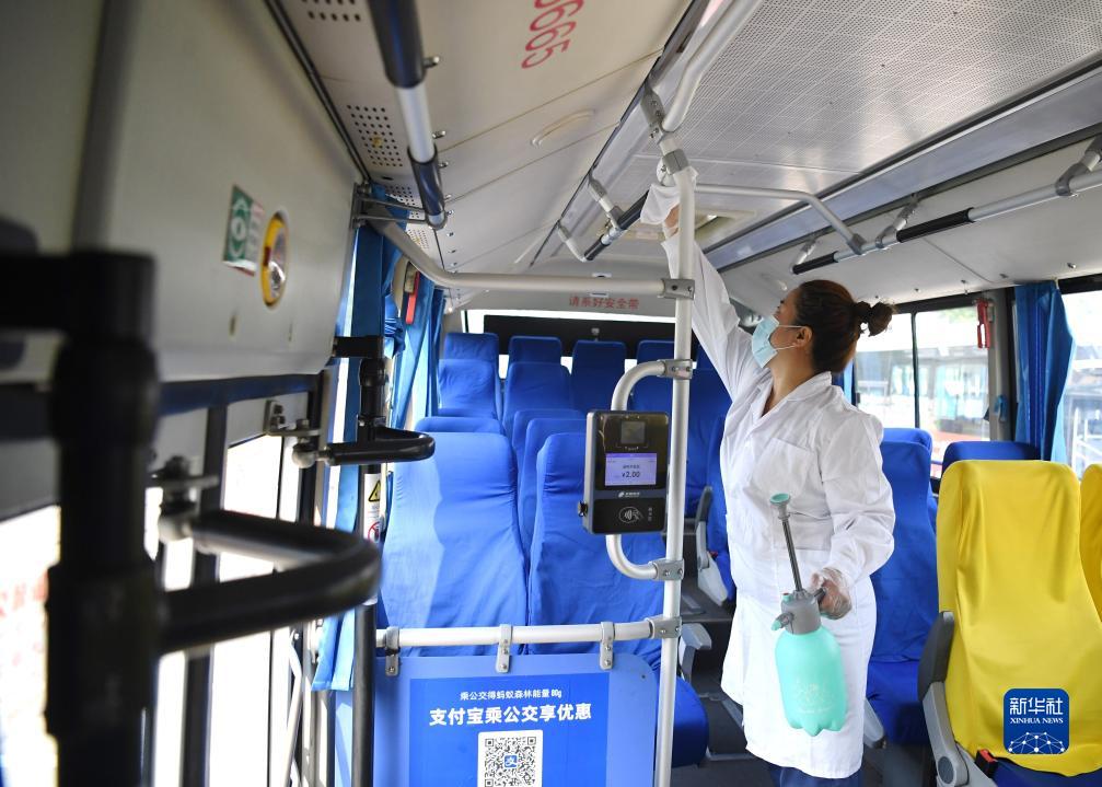 8月9日,河北省涿州市838路公交總站工作人員對車輛進行消毒。