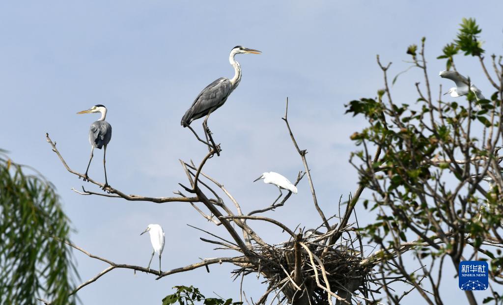 今年入夏以來,大量蒼鷺、白鷺等野生鳥類在山東省成武縣的文亭湖濕地內棲息。