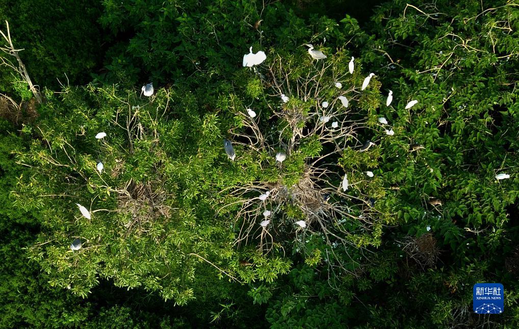 今年入夏以來,大量蒼鷺、白鷺等野生鳥類在山東省成武縣的文亭湖濕地內棲息。