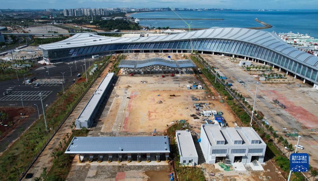 建設中的??谛潞8酆湍细邸岸€口岸”(客運)客運查驗設施、設備建設項目(無人機照片,8月4日攝)。