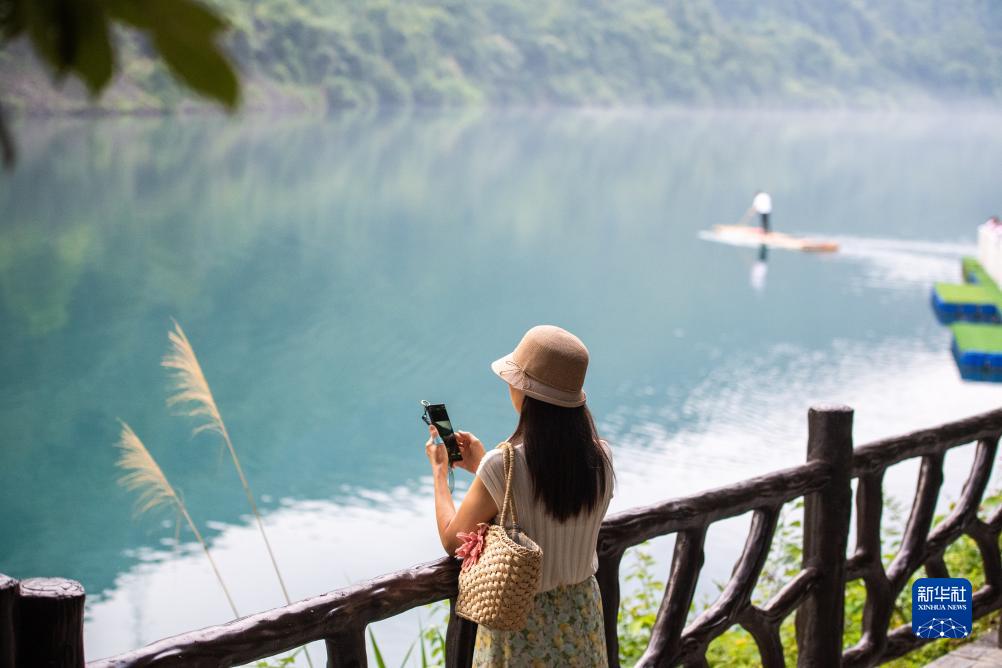 8月9日,游客在資興市東江湖風(fēng)景區(qū)游玩、拍照。