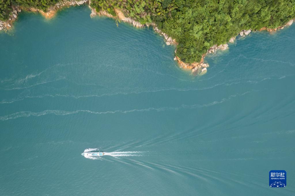 8月9日,游船行駛在資興市東江湖風景區(無人機照片)。