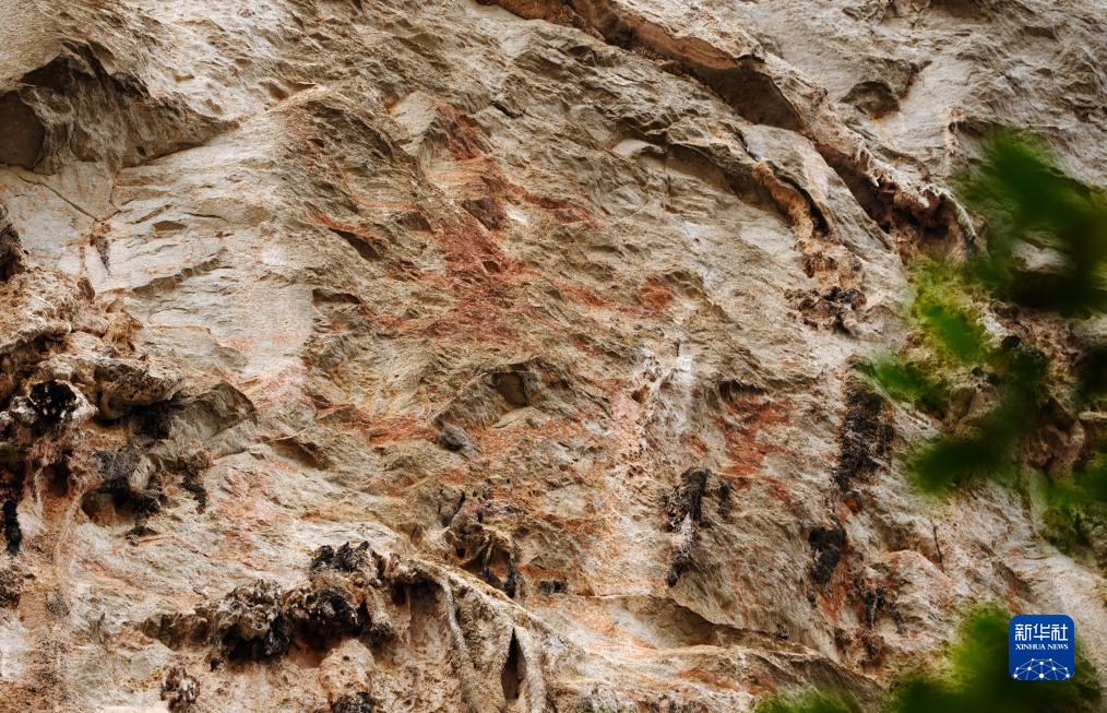 這是巖畫局部,這是目前發現的花山巖畫中最大的人像,高為3.58米(8月8日攝)。