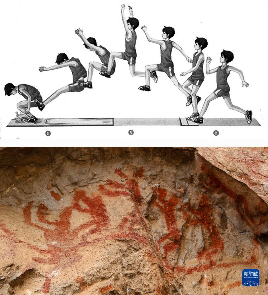 拼版照片,上圖為跳遠的分解動作;下圖為花山巖畫局部,看上去很像跳遠的分解動作(8月8日攝,新華社記者費茂華攝)。
