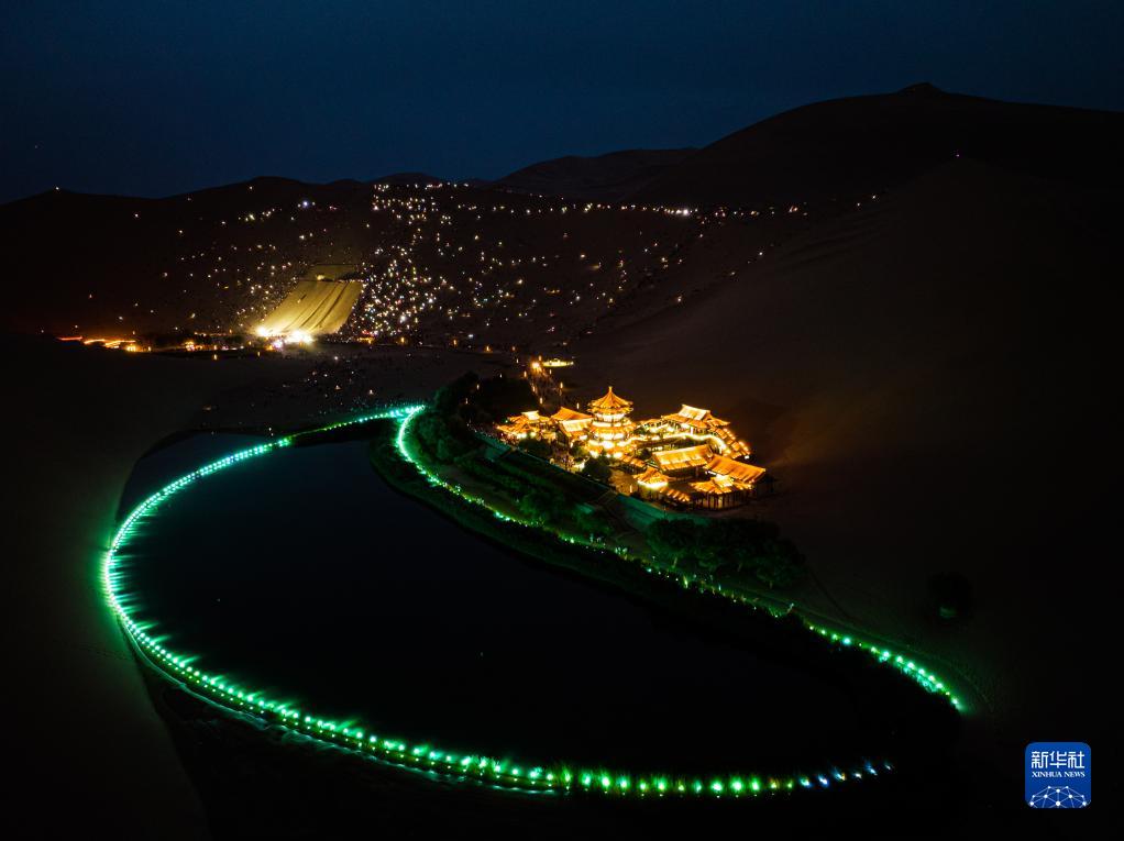 近期,甘肅省敦煌市鳴沙山月牙泉景區(qū)迎來暑期游客高峰。為豐富游客體驗,景區(qū)在夜幕降臨后舉行“點亮敦煌——鳴沙山月牙泉沙漠萬人演唱會”活動。游客們伴著音樂,揮舞點亮的手機(jī)唱歌互動,遙望夜幕下的月牙泉,感受別樣的景致。