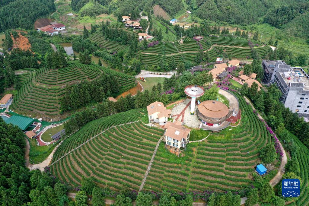 這是融水苗族自治縣融水鎮新安村水融香茶園茶葉種植基地(無人機照片,8月9日攝)。民宿、花廊、茶文化體驗館等文旅設施位于茶山上。