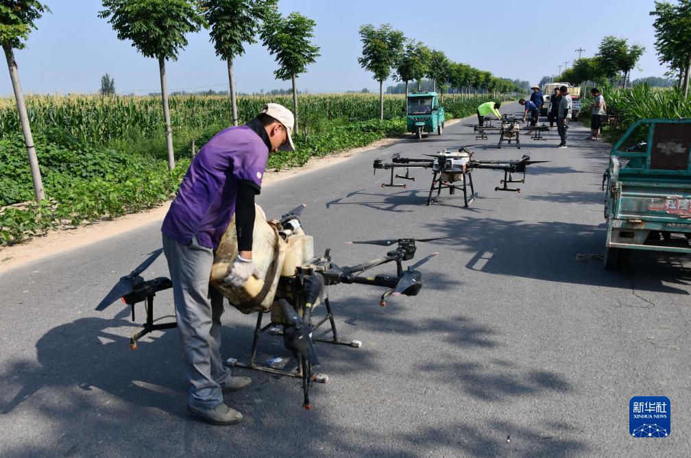 8月9日,在山東省成武縣孫寺鎮(zhèn),無人機(jī)操作手在做起飛前的準(zhǔn)備工作。