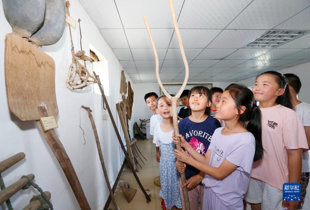 8月9日,山東省青島市即墨區(qū)龍山街道的小學(xué)生在前東葛村村史館體驗農(nóng)具的使用。