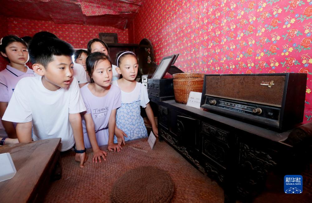 8月9日,山東省青島市即墨區龍山街道的小學生在前東葛村村史館參觀老式家具和物件。